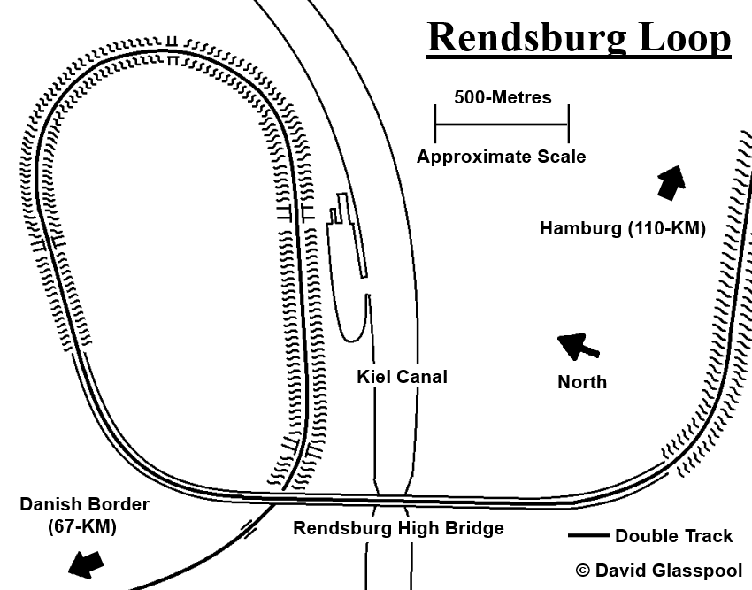 The first stop in Germany is Schleswig, 41-KM from Padborg. 30-KM from Schleswig, the railway crosses the Kiel Canal on the huge Rendsburg High Bridge. This picture was taken from the train when it was upon the "Rendsburg Loop", which is a circular section of railway that climbs to the height of the double-track steel bridge. © David Glasspool