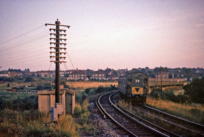A southward view shows a formation of 2-HAP units rounding the curve of the spur, heading towards the camera and about to join the North Kent Line at Crayford Spur "A" Junction. Allotments occupy the land on the left, whilst on the right of the track is Stanham Farm. © David Glasspool Collection