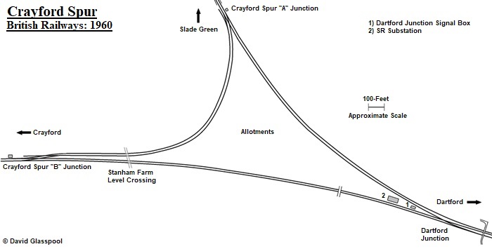 On the North Kent Line, the chord diverged at "Crayford Spur A Junction", which was situated a mile south of Slade Green station, Dartford station being 1,390-yards to the east. On the Dartford Loop Line via Sidcup, the junction was named "Crayford Spur B", residing 1,600-yards west of Dartford station. At both junctions, sturdy square signal boxes of brick construction were commissioned.