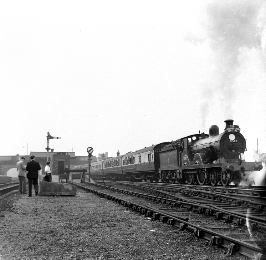 "D" Class No. 31577 is seen facing north at Hendon with "The Woburn Park Special". This rail tour took visitors from Waterloo to Flitwick for Woburn Park and Abbey. The tour was scheduled to depart Waterloo at 9:32 AM, with passenger pick-ups at Clapham Junction, Putney, South Acton, and Hendon. It was due to reach Harlington at 11:41 AM and Flitwick at 11:50 AM (ref: The Railway Magazine, September 1956). The return fare from Waterloo was 8 shillings 6 pence, which at 2023 prices is about £13.40; the return fare from Hendon was 6 shillings 6 pence. Completed in 1906 at Ashford for the Kent Coast lines, by this time No. 31577 had been demoted to local passenger trains around Guildford and was withdrawn from service little over two months after this picture was taken. The 1950 edition of the Ian Allan ABC Loco Shed book, current to 31st August of that year, had No. 31577 down as an Ashford (74A) engine. © David Glasspool Collection