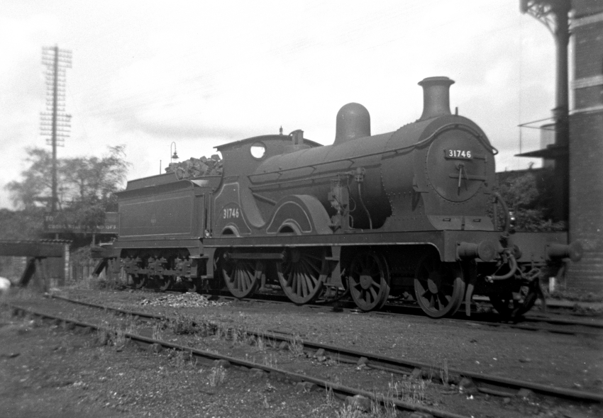 A grubby No. 31746, wearing BR lined black livery with early "Cycling Lion" crest, is seen at Reading. In the June 1951 edition of "The Railway Magazine", it was noted that No. 31746 had then recently arrived at Reading to join an existing allocation of Wainwright 4-4-0s — in the previous year, the engine had been shedded at Bricklayers Arms (73B) (ref: Ian Allan ABC Locoshed Book, 1950). The Reading-based Wainwright 4-4-0s were at that time deployed on passenger workings between there and Redhill. The brass dome had been painted over and the copper cap of the chimney gone, but these features aside, No. 31746 was still very much a Wainwright engine. She was one of a batch of five "D" Class locomotives, originally SE&CR Nos. 746 to 750, built by the Vulcan Foundry in Newton-le-Willows, Lancashire. No. 31746 remained in service until the end of 1954, being withdrawn from Guildford in December of that year (ref: RCTS’ The Railway Observer, March 1955). © David Glasspool Collection