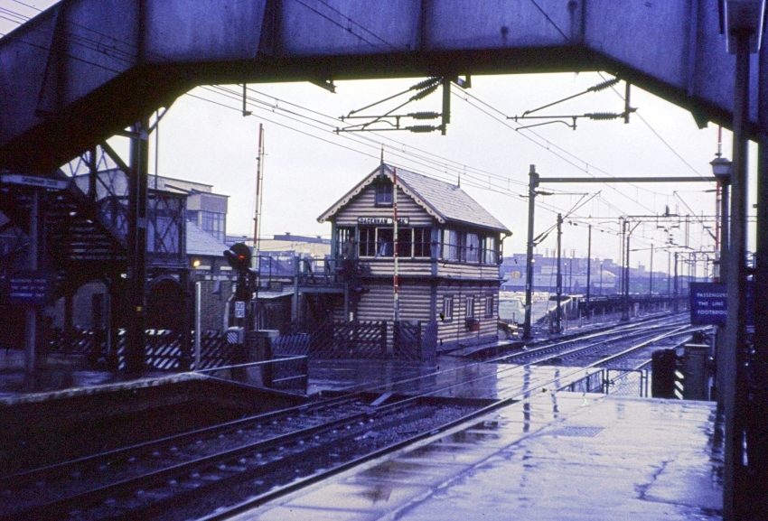 The footbridge span was replaced as part of the electrification works to accommodate overhead wires, and by the time of this 1969 view the manual level crossing gates had been replaced by automatic lifting barriers. The traditional gas lamps upon the platforms had been replaced by the then standard BR electric lighting. The former "down" side goods yard, behind the signal box, was by this time packed with cars. © David Glasspool Collection