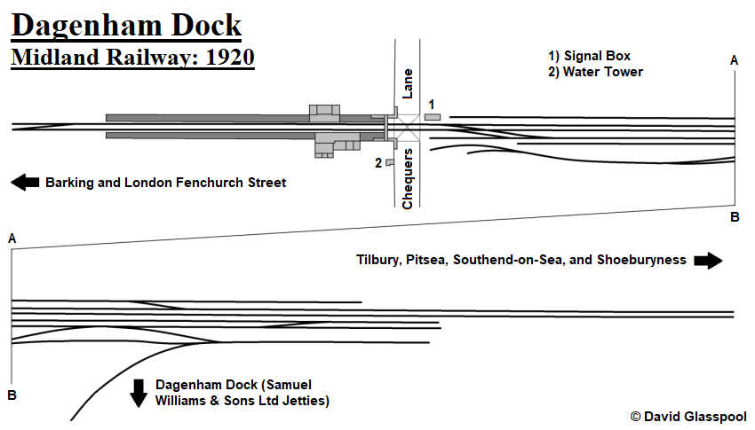All goods sidings here existed on the eastern side of the level crossing, flanking either side of the running lines. The connection with the branch to Dagenham Dock was indirect, requiring trains to make a reversing manouevre into a siding when running between it and the running lines. The formation of these tracks in about 1920 can be seen on the below diagram.