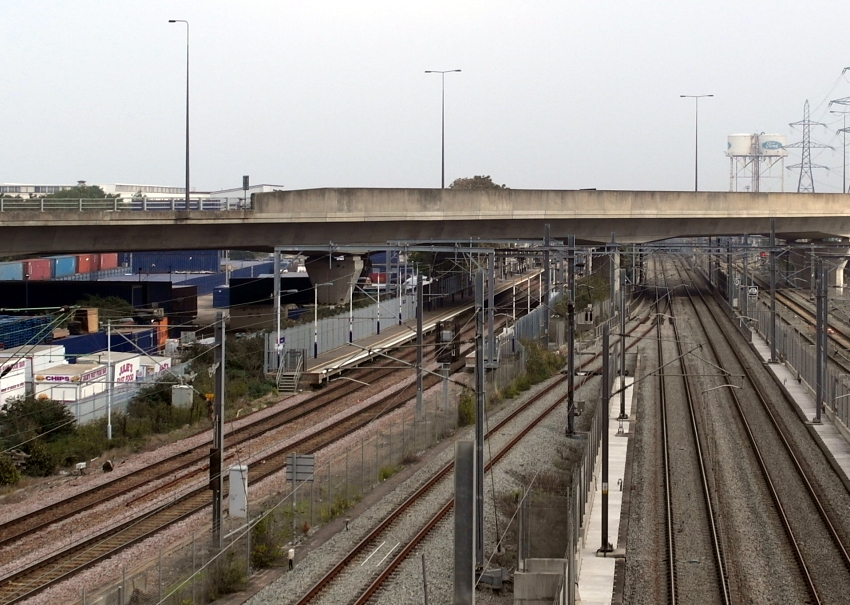 An eastward view from Choats Manor Way, which crosses the approaches to High Speed 1's (HS1) Dagenham Tunnel, shows the 1999-completed viaduct carrying the A13 over Chunnel and LT&SR lines, the double-track of the latter being on the left. The platforms of Dagenham Dock station, which were extended westwards under the viaduct in 2012, are evident amongst a sea of wires. On the far right are the rails leading to the sidings of the Ford Motor Company, which make connections with both HS1 and the LT&SR west of Dagenham Tunnel, on the throat of the former Ripple Lane Marshalling Yard. © David Glasspool