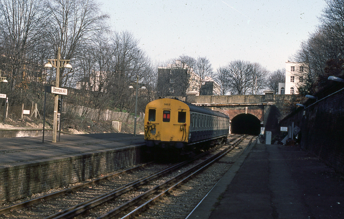 2 EPB No. 5653 is seen departing the station, about to plunge into one of the two 132-yard-long bores of Grove Tunnel. Concrete bracket lampposts with hexagonal lampshades are in evidence. © David Glasspool Collection
