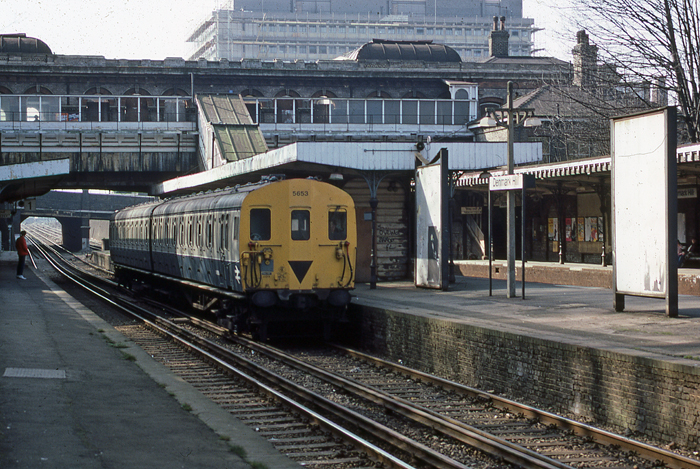Bulleid-designed 2 EPB No. 5653 is seen arriving at platform 2 on a Victoria to Bromley North service. Straddling the lines can be seen the fire-damaged "high-level" station building, a restoration of which was completed in 1984. In this view, the main building is missing its upper storey, which can be seen in the photograph on the following page. © David Glasspool Collection