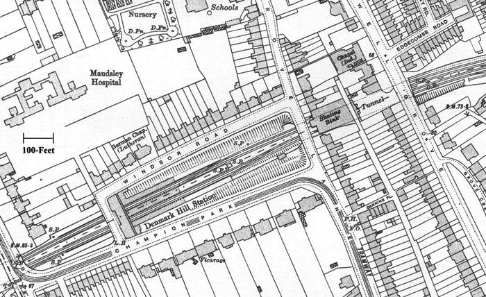 Ordnance Survey of 1914, showing Denmark Hill Tunnel at the bottom left of the map and Grove Tunnel nearer the top right. Position of the 1880 signal box is indicated, as are the trailing crossovers, but no links between SE&CR and LB&SCR routes existed at this point.