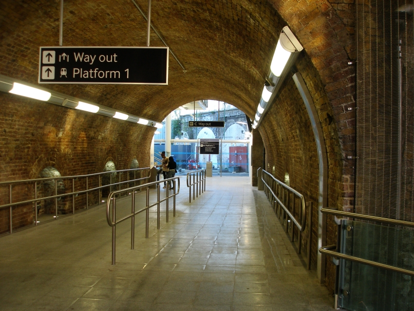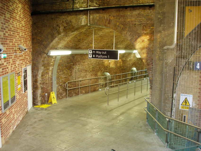 A good job has been made at cleaning up the brickwork within the station's subway and providing copious lighting. This is the view from the bottom of the "down" side staircase, the latter of which is wrapped around the lift shaft. © David Glasspool