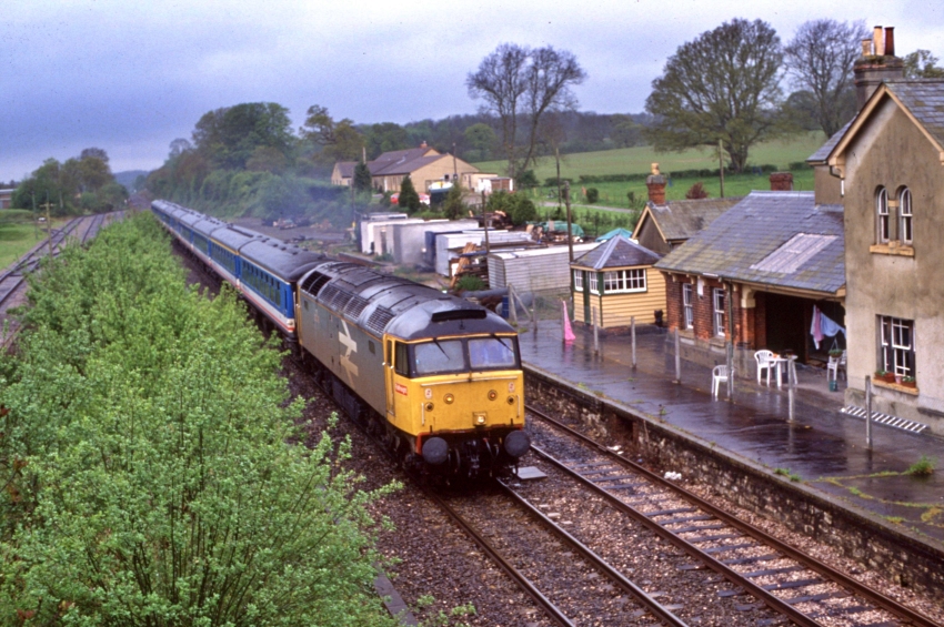 A now classic scene typical of that era which immediately followed the line's singling and degraded status as a secondary route. A "Warship" diesel-hydraulic is seen London-bound from Exeter, with what appears to be an ex-SR baggage car and rake of BR Mk 1 carriages in tow. These diesels were popular with enthusiasts, but based on contemporary articles written in the "Railway Correspondence & Travel Society's" journals, they were plagued by unreliability on Waterloo to Exeter workings, and eventually fell foul to the Western Region's policy of standardising on diesel-electric traction. The track upon which the train is seen was the only section of line which remained operational for BR services; the adjacent track, on the right, was used by the MOD for movements between Chilmark and Baverstock Depots. At that time, the "up" side goods yard more or less retained the full complement of sidings it had prior to the withdrawal of public freight traffic. The former "down" platform was no more than a mound of earth and rubble by this stage. On the left is RAF Dinton; both standard and narrow gauge tracks are in evidence. © David Glasspool Collection