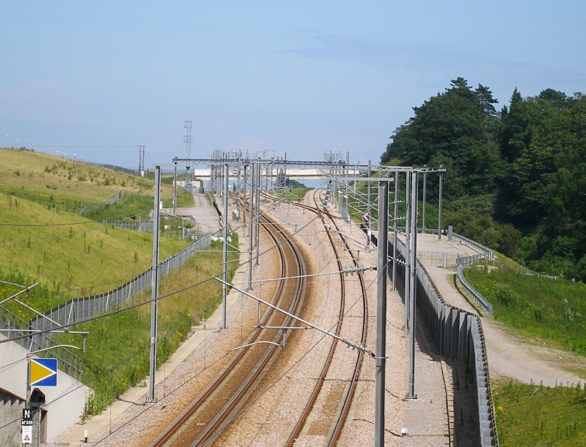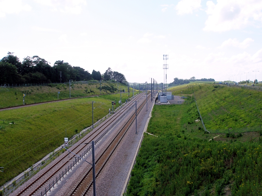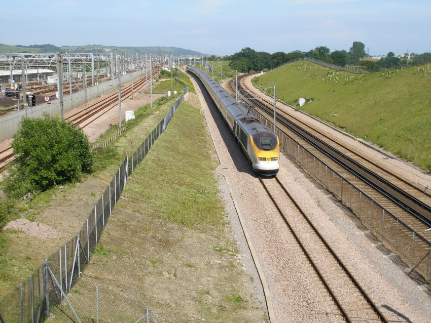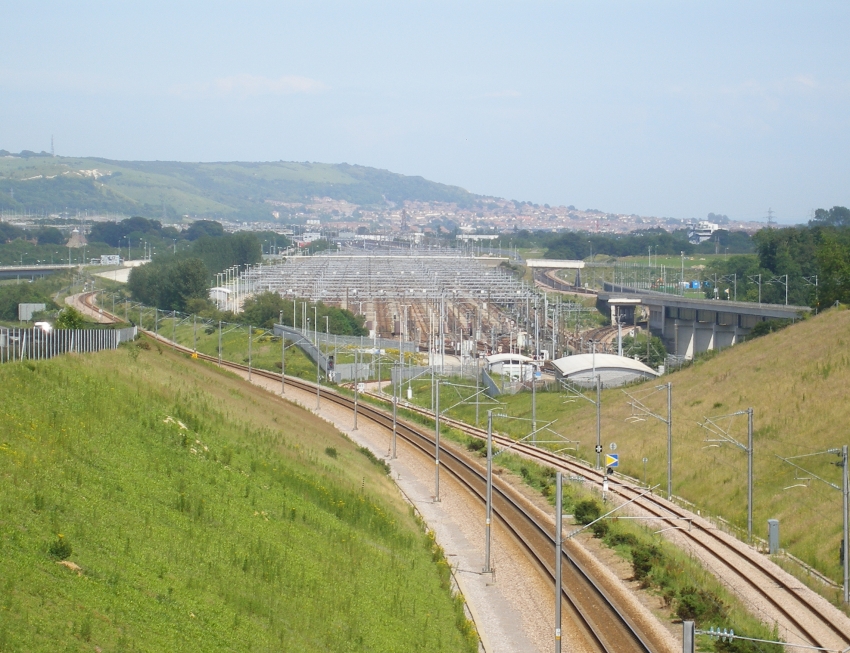 A westward view looking back towards Dollands Moor West Junction has, from left to right: "up" HS1 passenger; Dollands Moor chord; "down" HS1 passenger. Upon the embankment at the top right is the M20. © David Glasspool