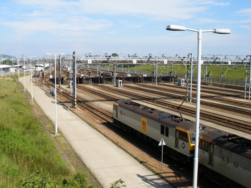 Another eastward view, now beyond Dollands Moor West Junction, shows a sea of gantries over the yard’s sidings. The steeply-graded link to Dollands Moor is the track on the right. In the right middle distance is Grange Alders Viaduct, which carries the "up" line of HS1. The two buildings with curved roofs are security and locomotive repair shed, left and right respectively. The "down" line of HS1 is that on the left, curving to the north of the freight yard. © David Glasspool