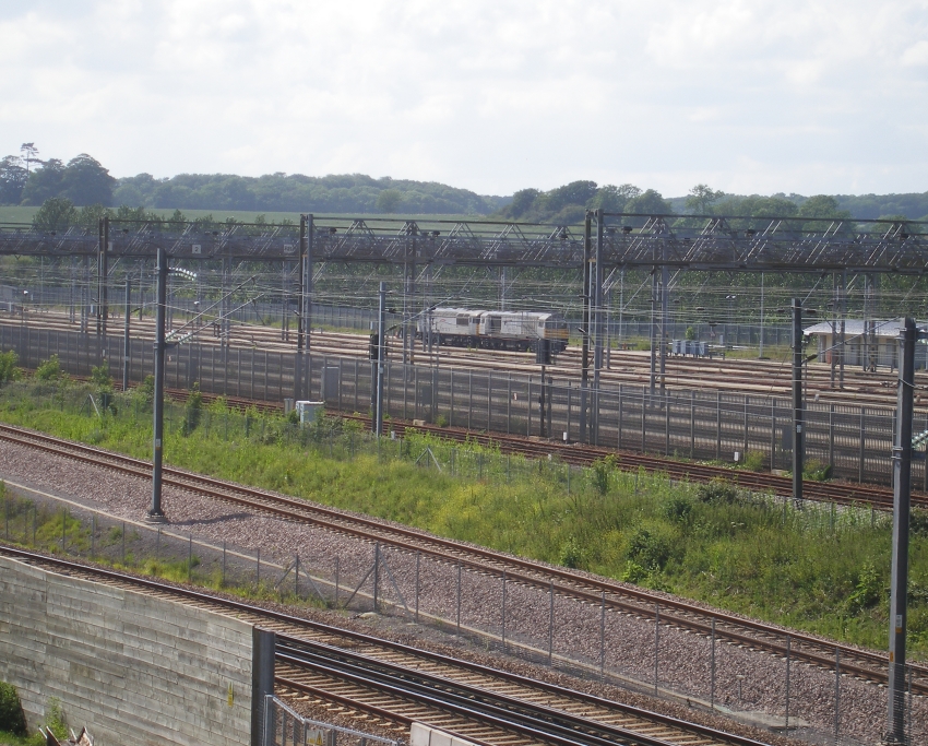 Front to rear in this north westward view: Kent Coast Main Line; "up" HS1 passenger; former Kent Coast Main Line alignment (today, Saltwood East Junction to the Eurotunnel boundary); Dollands Moor Freight Yard. In the background is a Class 56 and 58, wearing the colours of French infrastructure firm "Fertis". In summer 2004, English, Welsh & Scottish Railway announced that a contract had been signed with Fertis for the hire of forty diesel locomotives — 26 Class 56s and 14 Class 58s — to haul infrastructure trains in France in connection with the building of LGV Est to Strasbourg. The diesels started being returned in August 2006 as the project neared completion — the pair seen here would have recently arrived via the Chunnel. © David Glasspool