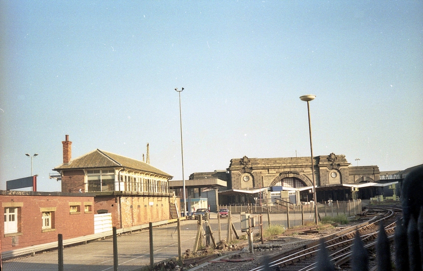The signal box eventually became isolated from the station, as shown in this southward view, after the lifting of two tracks which once ran along the quay on the station's north eastern side. Their removal also meant that trains from the Dover Priory direction no longer had direct access to Platform 3. A road was subsequently laid between the signal box and station approaches, as seen here, to give lorries access to the train ferry berth. © David Glasspool Collection