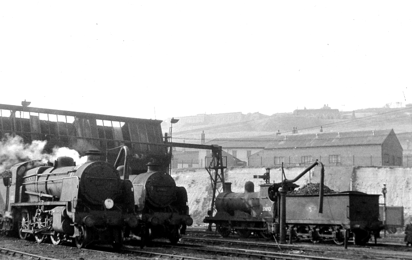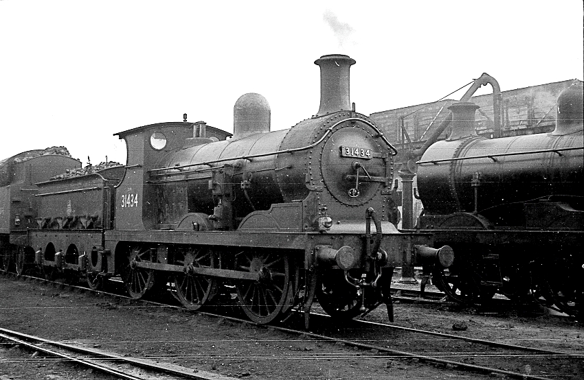 This view of "O1" Class 0-6-0 No. 31434 shows, in the background, wagons upon the elevated coal stage. No. 31434 was displaying the shed's "74C" code plate; the engine was still allocated to the shed in 1959, by which time it had been re-coded 73H. On the right is a "C" Class, a type used to shunt wagons on and off the train ferry, whilst on the left is the bunker of either a Fairburn or Stanier 2-6-4 Tank. © David Glasspool Collection