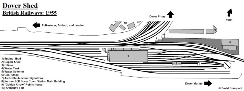 A new home for the locomotive shed that is being removed from the Priory Station will be found also at the Pier district, but the arrangements as to the exact site of this are not finally settled, and will depend on the negotiations in progress as to the land there. [The Dover Express and East Kent News, 19th October 1923]