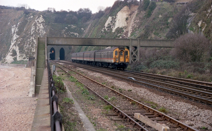 The Gothic portals of Shakespeare Tunnel are evident in the background of this view showing "Jaffa Cake" No. 1547 nearing journey’s end with a service from Charing Cross via Orpington. The prefabricated concrete footbridge linked the cliff top with Shakespeare Beach; it was closed on Christmas Eve 2015 with the line beneath it, when a routine track inspection found sink holes along the course of the line. The line remained closed until September of the following year, after £40 million of repairs, services between Dover and Folkestone recommencing on 5th of that month. A new footbridge across the line, to replace the one pictured above, did not come into use until March 2017. © David Glasspool Collection