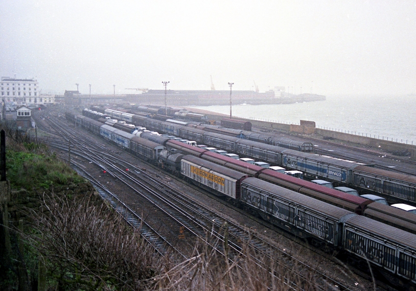 Prior to the advent of the Channel Tunnel, this was an important marshalling yard for continental freight traffic. Since the railway first reached Dover as long ago as 1844, the site below the town’s Western Heights has evolved from that of a terminus station, to a motive power depot, to a marshalling yard and, finally, a lorry park. The spectacle of wagons below the White Cliffs bearing legends such as Transfesa and Ferrywagon is in the long-distant past; however, the railway enthusiast only has to journey less than ten miles west, to the sidings at Dollands Moor, to observe overseas freight traffic in action, albeit via the tunnel rather than seaborne.