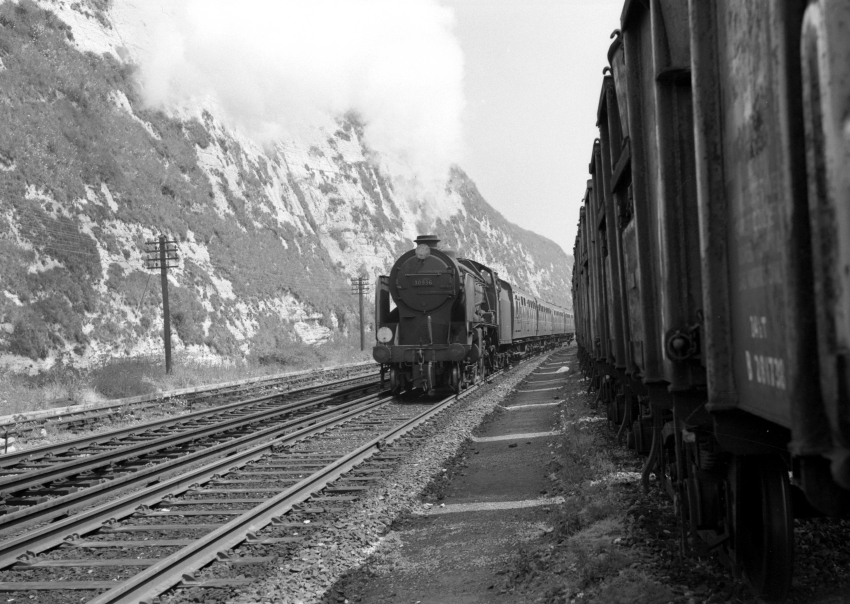 An eastward view depicts "Schools" Class 4-4-0 No. 30936 "Cranleigh" heading towards Shakespeare Tunnel with a Charing Cross via Tonbridge and Orpington service. The tunnel portals are about 200-yards behind the camera and, naturally, the sea wall is beyond the vans on the right. By this time, catenary had been erected over a series of sidings in the yard for the E5000 series (Class 71) electrics. After electrification of the Kent Coast routes, No. 30936 was reallocated to Nine Elms (70A) and withdrawn from that shed in December 1962 (ref: RCTS’ The Railway Observer, February 1963). © David Glasspool Collection
