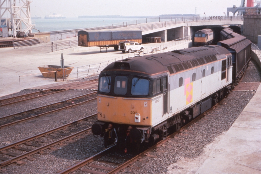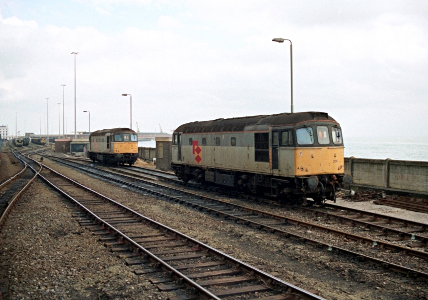 In this eastward view, Class 33 Nos. 33206 and 33205 are seen stabled in Town Yard. In 1991, they were two of four locomotives allocated to Railfreight Distribution’s "FDIB" pool, which was dedicated to working the train ferry link span at Dover. The other two locomotives, also Class 33 diesels, were Nos. 33203 and 33211, and the pool was officially Stewarts Lane-allocated. © David Glasspool Collection