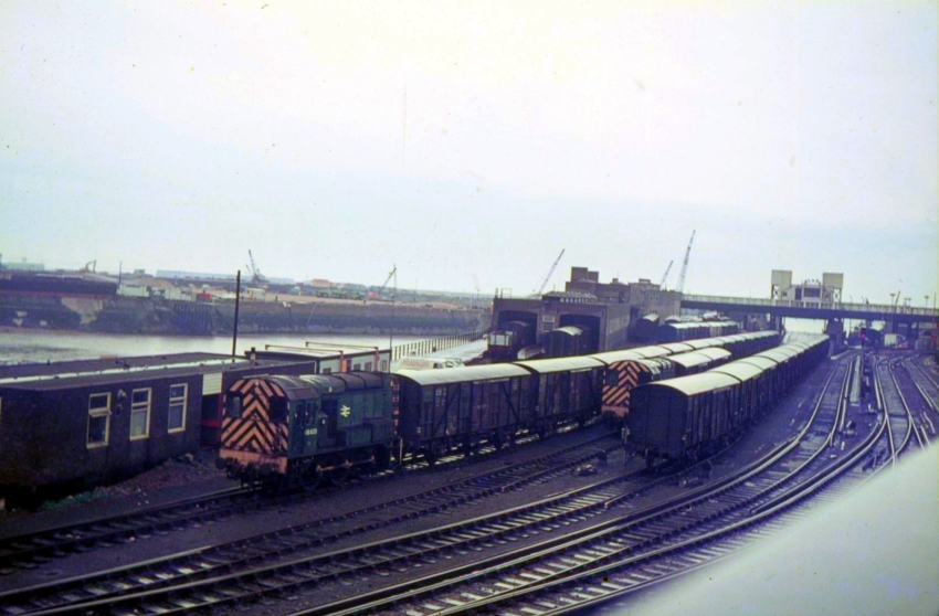 Formerly, south of Hawkesbury Street Junction, a footbridge crossed those tracks that led to the train ferry dock and Marine station from the Priory direction. A roughly eastward view from the footbridge shows Class 08 shunter Nos. 08892 and 08833 in the train ferry sidings. The location of the train ferry dock is marked in the background by the two towers of the ramp that bridged the gap between land and vessel. The enclosed footbridge in the background, erected by the Southern Railway and built to the same design as that still in existence at Swanley, linked the car clearance shed and train ferry dock with Lord Warden Square, the latter adjacent to the former hotel that later became "Southern House". Behind the vans, just right of centre, is the Customs Transit Shed, whilst on the far left is Tidal Basin. The tracks that curve to the right in the background continued to Marine station. © David Glasspool Collection
