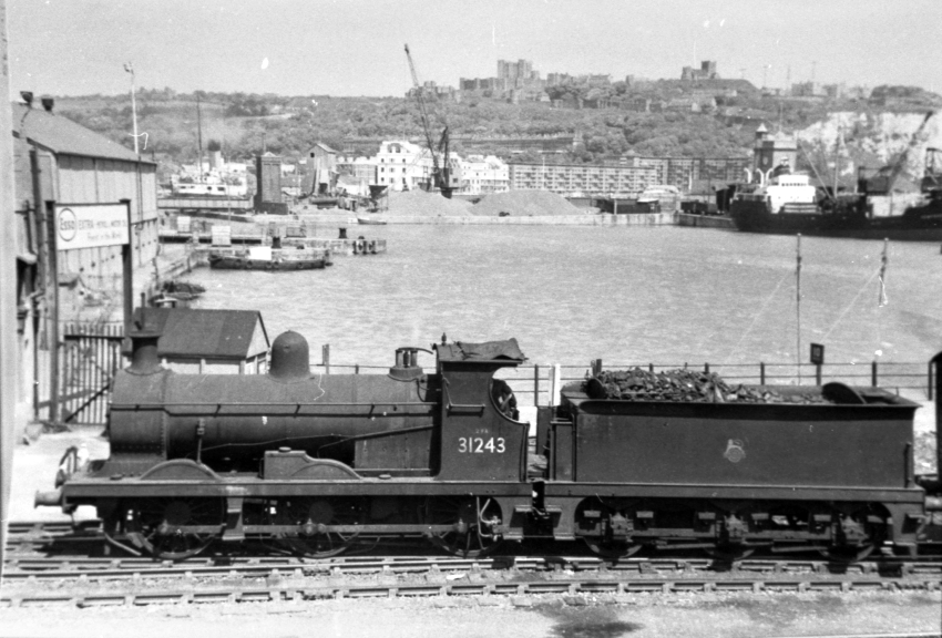 A northward view depicts "C" Class 0-6-0 No. 31243 upon the tracks that led to the Customs Transit Shed, the latter of which is out of view to the right. "C" Class engines were permitted to run onto the train ferry. Behind the locomotive is Tidal Basin, beyond which can be seen the mansions of Waterloo Crescent (still extant today) along the seafront and, prominent on the clifftop, Dover Castle. Hawkesbury Street Junction, the former Dover Harbour station, and Dover Priory are in the leftward direction. In the December 1959 edition of "The Railway Magazine" it was reported that No. 31243 had been withdrawn from ordinary Southern Region stock. © David Glasspool Collection