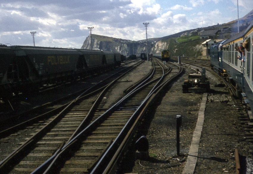 A westward view captured from the "Man of Kent" rail tour — a Kent Coast circular from Victoria, hauled by "Deltic" No. 55007, that also ventured to Bognor Regis — includes those sidings of Dover Town Yard that occupied the former site of the engine shed. As evidenced here, two sidings were equipped with third rail to berth electric passenger stock. On the right, in front of the "Deltic", is Archcliffe Junction signal box. The hopper wagons on the left were owned by "Polybulk Limited", a consortium of international experts in transport engineering and the distribution of bulk solid, and were used to transport grain from the continent. The first train of maize from Lavaur, France arrived at a grain silo in Pinhoe, Exeter on 28th August 1974, formed of "Polybulk" hoppers, although these travelled on Zeebrugge to Harwich train ferry, rather than via Dunkerque and Dover. © David Glasspool Collection