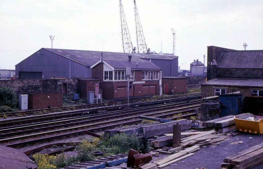 A south eastward view shows Hawkesbury Street Junction signal box, which was opened by the Southern Railway in 1934. It was situated upon the former site of the closed Harbour station’s "down" platform — indeed, the retaining wall of the latter is evident in the background and was level with the rear of the signal box. The rear wall of the signal box’s base is still evident today, the cabin having closed in April 1998. Harbour Tunnel and Priory are to the left; Western Docks station and Folkestone to the right. On the right is the end of the former Harbour station's main building, which today houses a gym, concert hall, and shipping offices. © David Glasspool Collection