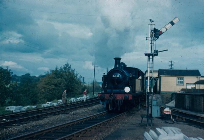 A 1960 view depicts ''H'' Class Tank No. 31263 stabled at the branch line platform at Dunton Green, fronting a Maunsell push-pull set bound for Westerham. In the background can be seen the SE&CR-built signal box, which replaced a Stevens & Sons cabin perched upon the apex of the branch and main line ''up'' platforms. © David Glasspool Collection