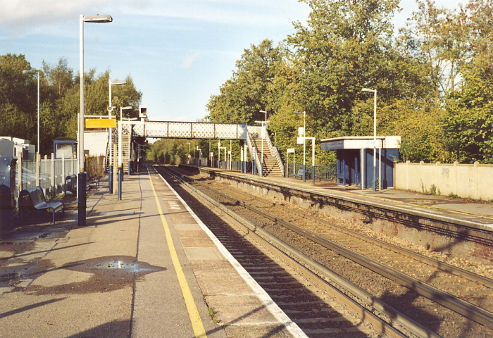 A northward view from 20th October 2006 reveals that the ex-Grove Park lattice footbridge is the only structure of vintage significance. On the right is a featureless CLASP shelter, whilst the fenced off area on the left marks the former location of the main clapboard station building. The demolition of this structure, and of the CLASP shelter on this side, allowed the extension of the car park. On the far right can still be seen the concrete platform backing of 1934 origin. © David Glasspool