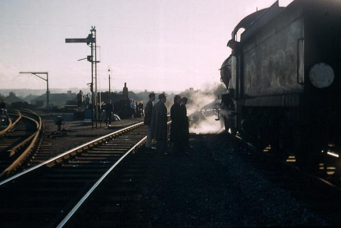 The sun sets on the final day of operation along the Westerham branch. In this southward view, SE&CR D1 Class 4-4-0 No. 31739 is seen at Dunton Green, upon the branch line spur to Westerham, alongside a group of enthusiasts. Curving off sharply to the left are the rusting rails of the goods yard, complete with loading gauge. No. 31739 was also at the end of its operational life, and was withdrawn in the following month. © David Glasspool Collection