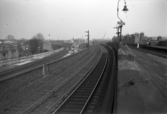 The LB&SCR was amalgamated with other independent concerns into the ‘’Southern Railway’’ in 1923. In August 1926, it was announced by the SR Board that the A.C. overhead wire system on Central Division routes would be abandoned and replaced by the ex-LSWR’s 600 Volts D.C. third rail. By this time, the wires had already been extended to the Crystal Palace lines. The wires ceased to be used along the SLL on 17th June 1928, the route being worked on the third rail system thereafter. On 9th August of the previous year, East Brixton signal box had been taken out of use. Maps suggest that the electrical switch room here was retained after the abandonment of the overhead system – indeed, many of these became stores for the permanent way department. At this time, the trailing crossovers at either ends of the station were removed and the SR’s trademark ‘’Swan Neck’’ lampposts, complete with ‘’Target’’ name signs, installed. A staff track foot crossing, a feature of the site from the outset, was maintained midway between the platforms. Early economies saw the closure of the original booking office within the brick arches, and timber huts were subsequently erected on each platform to issue tickets.