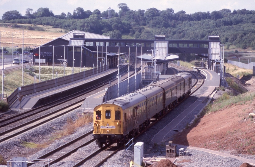 Hastings DEMU No. 1001 is seen passing East Midlands Parkway on the "slow" lines, southbound, on the return working of the "Midland Forester", which was a round trip excursion from Hastings to Nottingham. The short length of the "slow" platforms compared to those serving the "fast" lines is evident in this northward view. © David Glasspool Collection