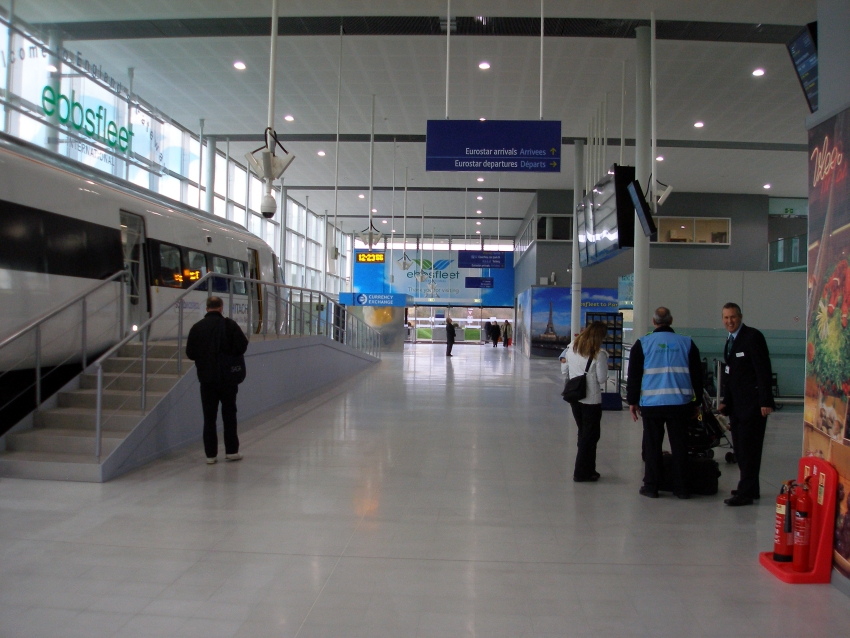 A Chunnel-bound view shows two international services stabled at the platforms. In the foreground is Class 373 No. 3220 (pairing with No. 3219), forming the 12:44 departure to Paris, whilst behind is the 11:59 from Brussels. In the foreground is the "down" station avoiding line. © David Glasspool