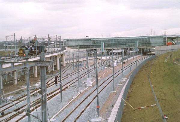 The station approaches are observed. The station building here is to the same basic design as that at Stratford International. On the elevated domestic line is a visitor to the area: Class 14 Shunter No. 14029. Between 1988 and 2000 inclusive, this locomotive was on the Nene Valley Railway, but since, it has appeared on Channel Tunnel contract work. It currently wears the all-over BR Blue guise. © David Glasspool