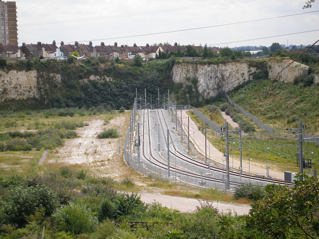 An eastward view across the redundant chalk pit of the former Bevan Cement Works shows the now completed Church Path Pit sidings. In the foreground can just be seen, within the vegetation, stacked up track from the former British Rail connection with Northfleet Cement Works. © David Glasspool