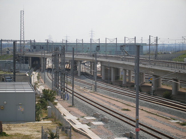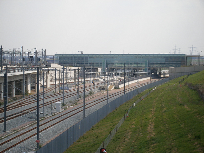 The façade has now been fully glazed, as have the lift shafts. Completion of the station came on 12th September 2006, although it was not until January of the following year that 25,000 volts were put through the overhead wires. Landscaping of terrain out of view, to the right, continues. © David Glasspool