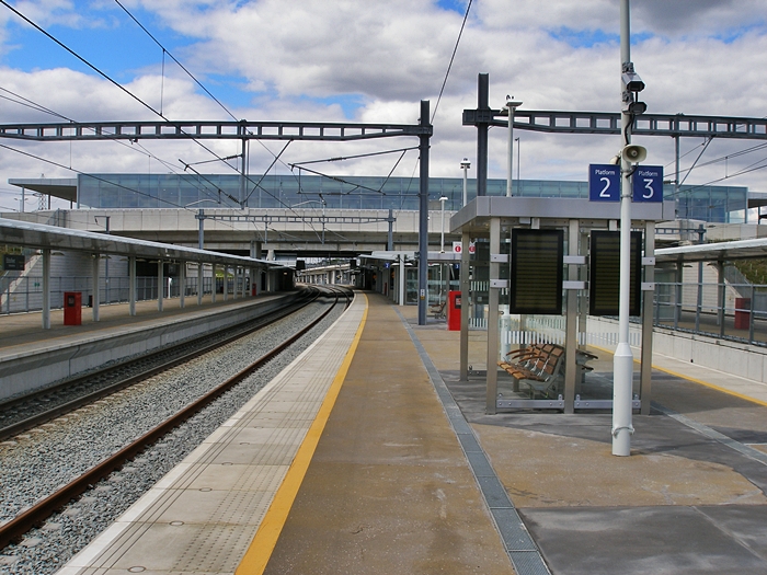 At the foot of the escalators, which bring passengers down from the ''high-level'' building to the island platform, exists a large enclosed glazed waiting room. It is complemented further along the platform with small waiting shelters. © David Glasspool