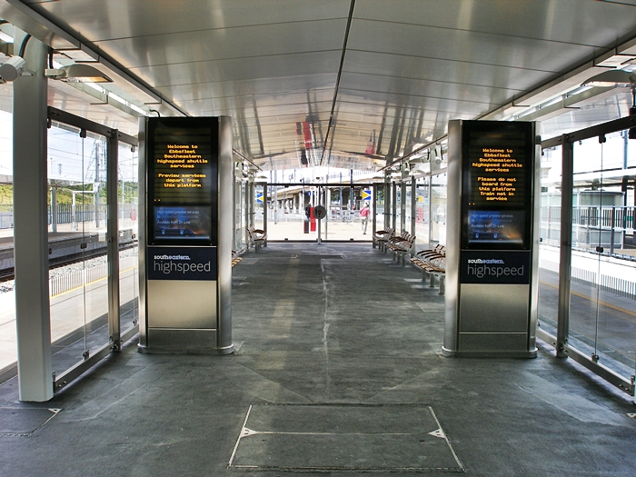 Platforms 1 and 4 are dedicated to Eurostar, whilst platforms 2 and 3 serve the domestic service. Of note in this London-bound view is the single track gap, on the right, which separates the domestic island from the ''down'' Eurostar platform surface. To ensure complete separation of operations, the Eurostar platform is fenced off at the rear. © David Glasspool