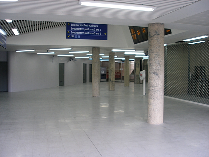 Underneath the ''high-level'' domestic island (platforms 5 and 6) for the North Kent Line exists a hall which houses ticket machines and lifts to the above surface (yet to be opened at the time of this view). This entrance can be used as a passageway to the main station building. © David Glasspool