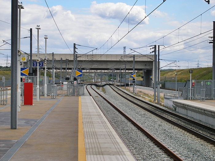 A southward view shows what appears to be a potential road bridge span, in anticipation of office development taking off. The yellow and blue triangular signs are block markers for the TVM430 in-cab signalling used on the CTRL. © David Glasspool