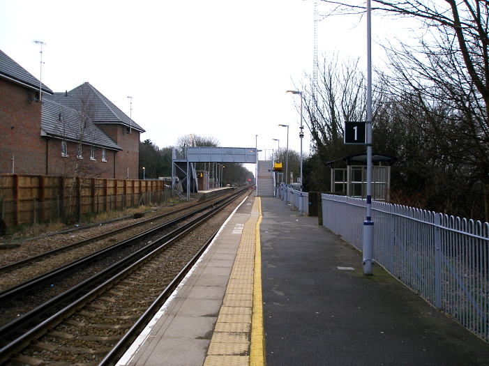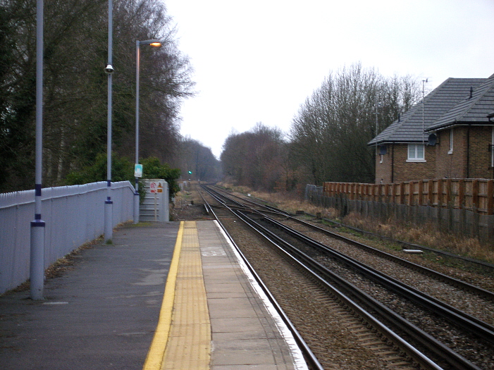 The station has for long existed in the shadow of the ex-LB&SCR's grand "Edenbridge Town", the latter of which retains its vintage buildings. A Tonbridge-bound view presents a depressing image of the ex-SER's Edenbridge, which became a victim of British Rail "modernisation" in 1971. The station retains the staggered platform arrangement of the SER, but the track foot crossing was abolished in 1990 in favour of a footbridge, as part of the electrification of the route over the 1990/1991 period. The "up" side waiting shelter on the right dates from 2008. © David Glasspool