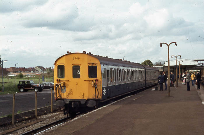 2 EPB No. 5746 is seen in the "up" bay line on the last day of services on the Woodside to Selsdon line. The canopy valance and concrete lampposts date from 1961. The car park on the left occupies the former site of the goods yard. © David Glasspool Collection