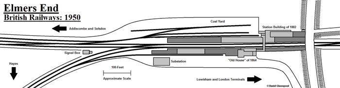 This is a site which has witnessed much change, both to its railway connections and platform structures, the latter partly courtesy of the Luftwaffe. At Elmers end, passengers once had the option of interchanging between trains for three separate routes: branch lines to termini at Addiscombe and Hayes, and a through route which connected to the Oxted line at Selsdon. Today, the scene is very different: the former British Rail lines to Selsdon and Addiscombe have long since been erased from the map, and the station at Elmers End is now shared with a standard gauge light rail line, better known as the "Croydon Tramlink". Indeed, should the ambitions of the proposed southward extension of the Bakerloo line ever be fully realised, the Lewisham to Hayes National Rail route will also be no more.