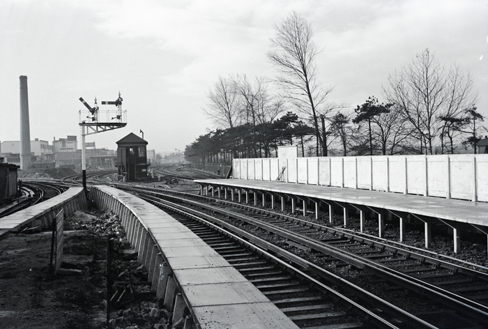 A southward view in 1957 shows extension of both platforms in progress. The Addiscombe line had recently been re-routed to the left of the signal box, but connections to the "up" side goods yard remained to the right of the cabin. Note the catch points on the "down" bay line. © David Glasspool Collection
