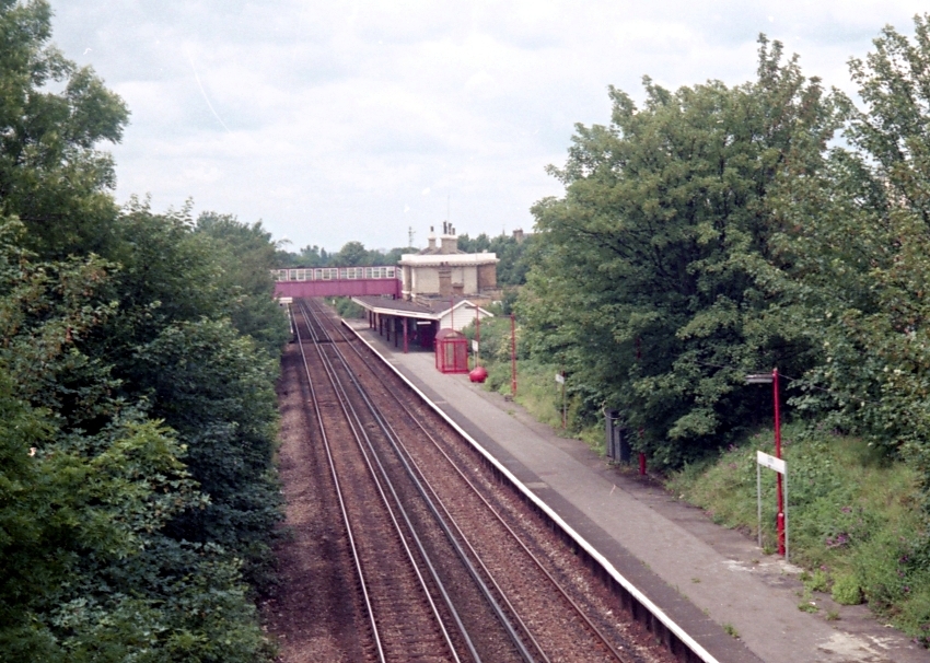 The leafy environs of summer make it hard to believe that the station is located within a sprawling industrial suburb of South East London. Another north westward view from the road bridge shows the station not long before restoration began. The "down" platform (right) had gained a glazed shelter and the station was wearing the red colour scheme of BR business sector "Network SouthEast". © David Glasspool Collection