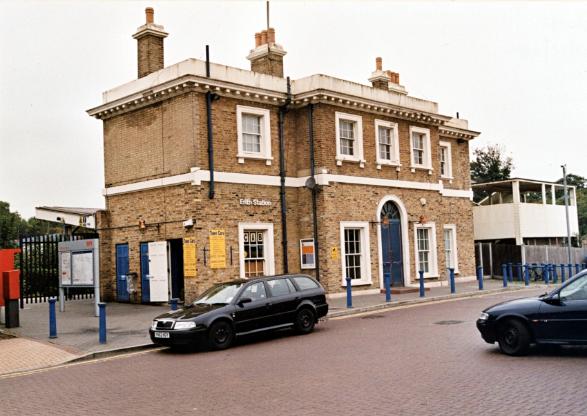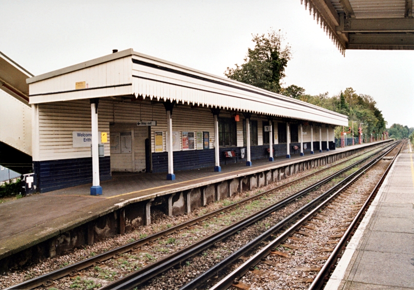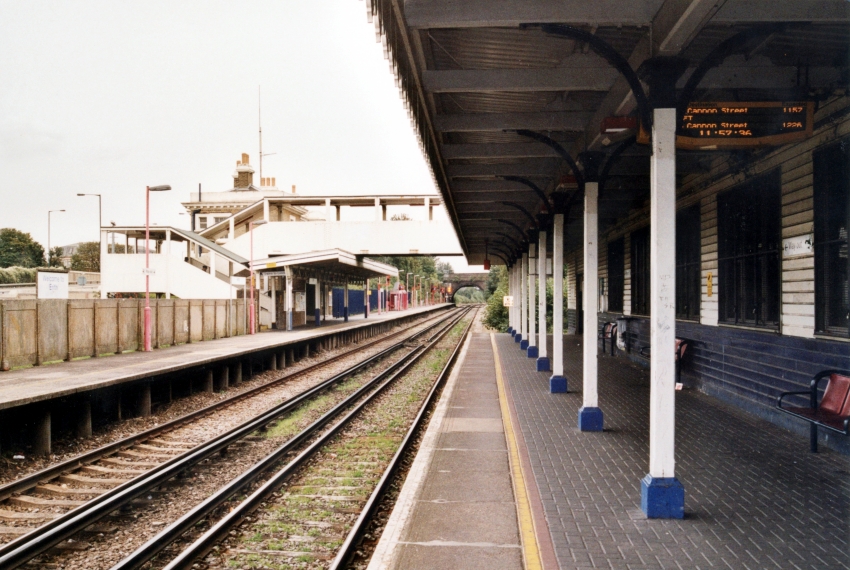 Looking towards Dartford from the "up" platform, it is evident that the footbridge is shorn of its glazing, this having been removed as part of the restoration project completed in 1994. On the left is the prefabricated concrete extension of the "down" platform that dates from 1956. The track foot crossing had long gone, but gaps in the conductor rails to accommodate it were still present. © David Glasspool