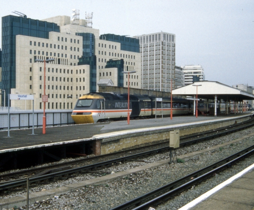 The Manchester Piccadilly to Waterloo HST 125 service is seen cruising through Kensington Olympia, wearing full InterCity ''Swallow'' livery. Power car No. 43092 is leading. © David Glasspool Collection