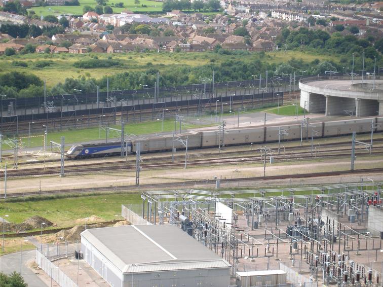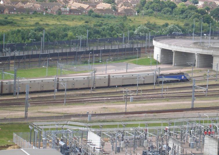 Refurbished No. 9809 is observed departing Cheriton with a Passenger Shuttle. To ensure that drivers are not hypnotised, Shuttle locomotives have been designed with cab windows which limit how much can be seen immediately in front of the driving position. Thus, the first 65 feet of track in front of the locomotive cannot be seen by the driver, thus helping to prevent hypnosis by a quick succession of sleepers passing by. Furthermore, thick cab struts either side of the main two windows also ensure that the driver cannot be hypnotised by identical tunnel segments flashing by. © David Glasspool