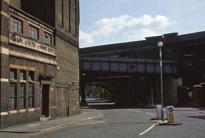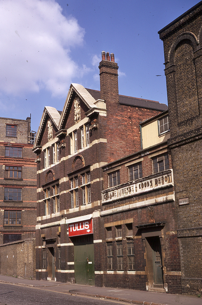 A splendid three-storey-high red-brick structure, frescoed with stone, once acted as the depot's frontage on Great Suffolk Street. At this time, "Grande Vitesse Goods Depot" was still engraved in stone, but the depot behind had been converted to accommodate rolling stock berthing sidings. © David Glasspool Collection