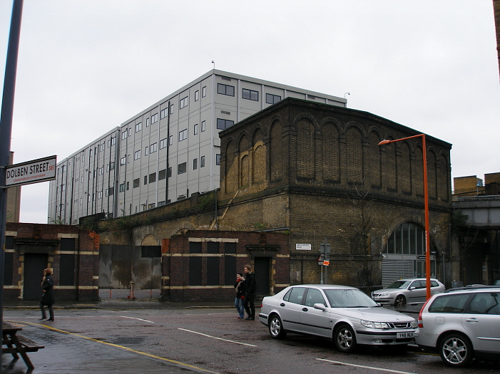 A view from ground level shows the huge brick base of Southwark Continental Freight Depot. The prefabricated offices on top emerged during 2004. To the left is the remaining ground floor wall of the demolished three-storey-high red-brick structure seen on the previous page. © David Glasspool